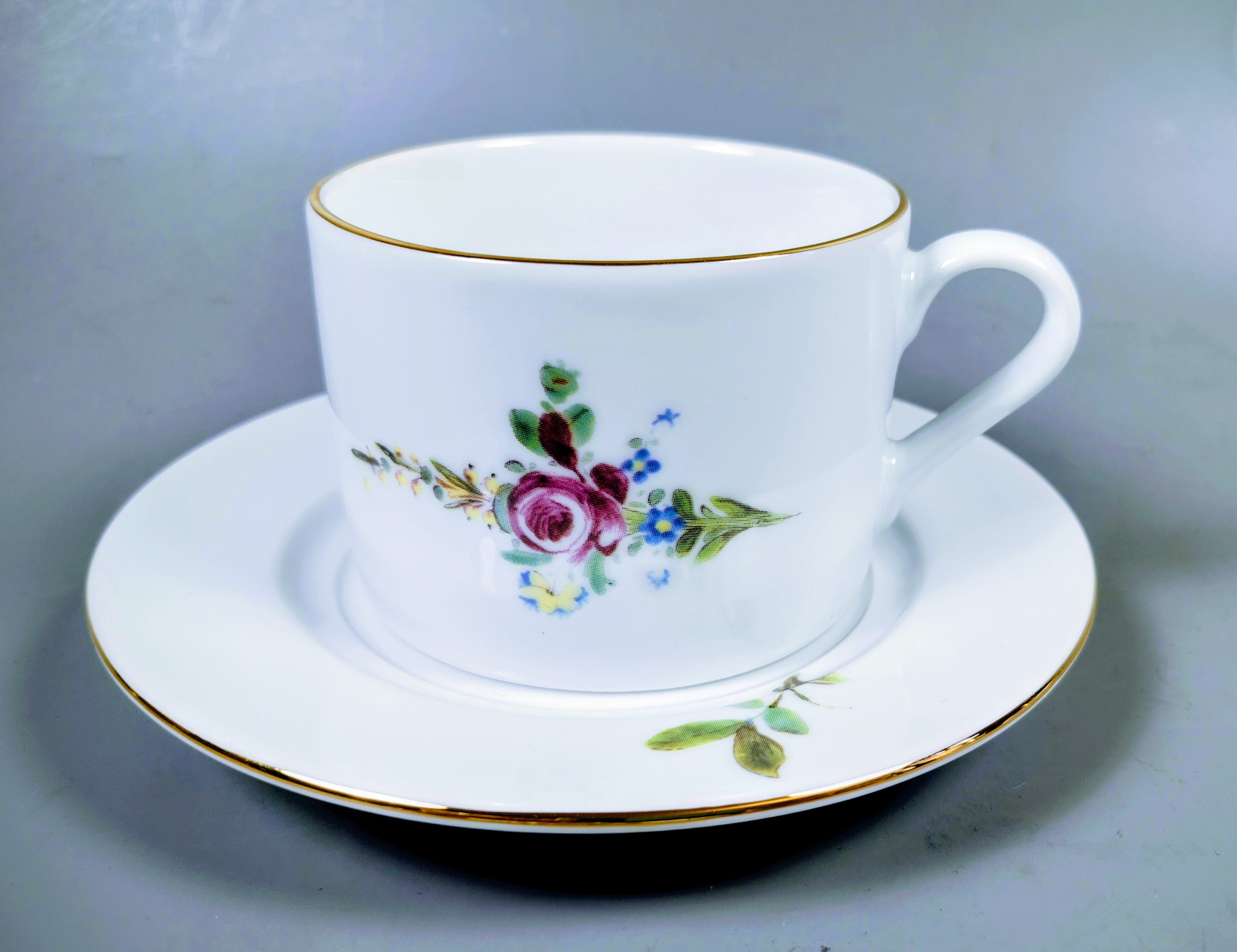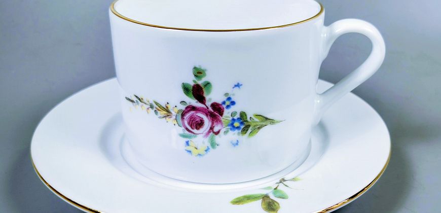 Motyw kwiatowy filiżanki zaczerpnięty został z fajansowej patery powstałej w latach 1764-1769 w legendarnej wytwórni fajansu w Prószkowie, za czasów Leopolda Prószkowskiego. Bukiet użyty do dekoracji filiżanki skomponowany został z gałązek różowokarminowej róży, niezapominajek i drobnych kwiatków w kolorze żółtym. Listki na talerzyku pochodzą z dekoracji tej samej patery, pozostającej w zbiorach gliwickiego muzeum od czasów międzywojennych. Patera, z której zaczerpnięto motyw reprezentuje fajans zwykły, pierwszy, jaki pojawił się w ofercie prószkowskiej fajansarni.