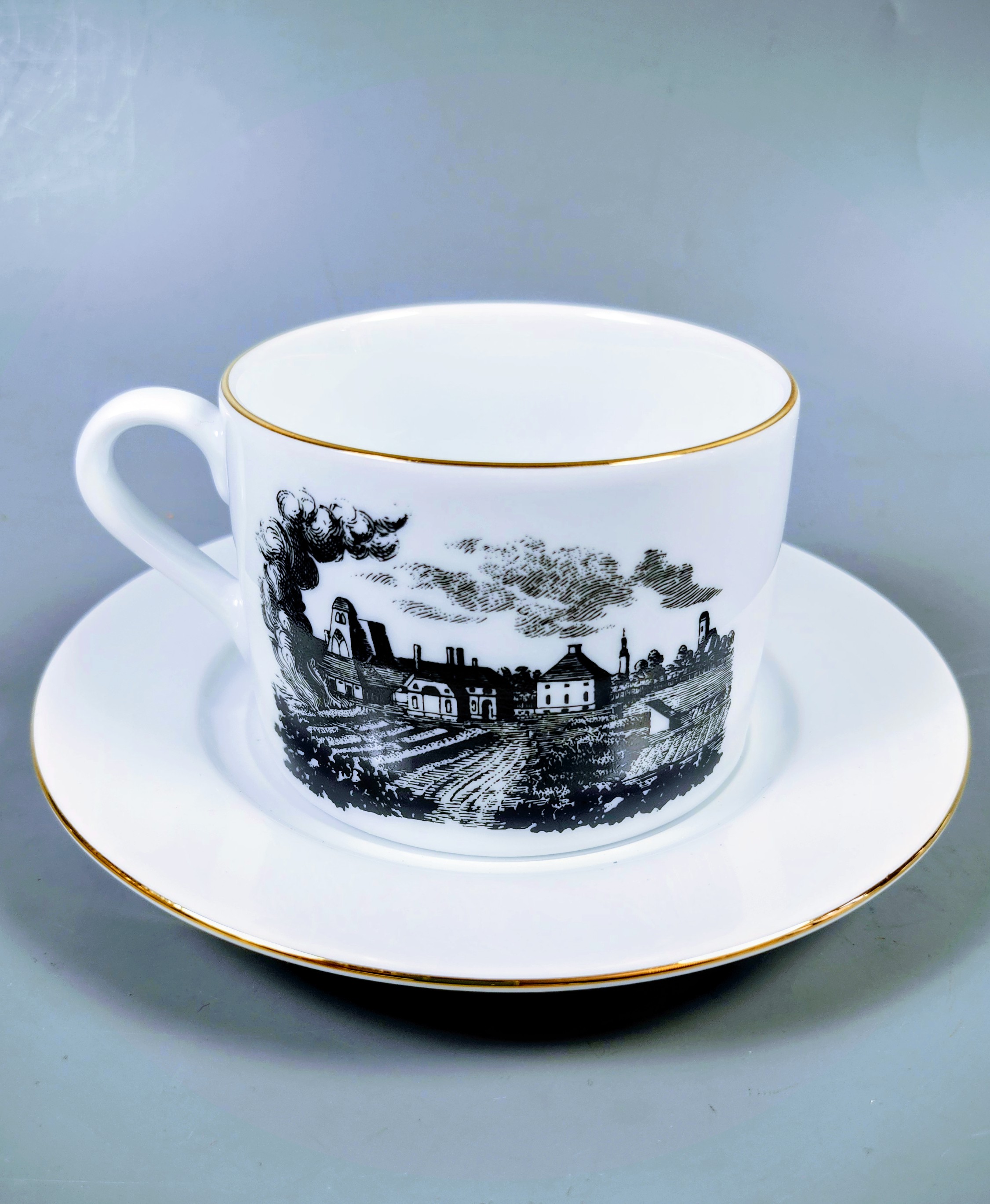 Dekoracja filiżanki z motywem gliwickiej huty oparta jest na dwóch identycznych miedziorytach, których użyto do dekoracji fajansowego talerza i pokrywy teryny (naczynia w którym przygotowywano pasztety, mięsne galarety), znajdujących się w kolekcji fajansu prószkowskiego w gliwickim muzeum. Reprezentowały tak zwany fajans delikatny, produkowany z latach 1796-1821. Motyw umieszczony na boku filiżanki to jeden ze starszych widoków gliwickiej huty. Jego niewątpliwym walorem jest realistycznie pokazany wielki piec gliwickiej giserni (odlewni). Widoki idealizowane i odwołujące się do autentycznych pejzaży Górnego Śląska, sięgające po motywy architektury Dalekiego Wschodu i budownictwa miejscowego, „wydumanych” jak mawiano pejzaży, są szczególnie interesujące i cenione przez kolekcjonerów.