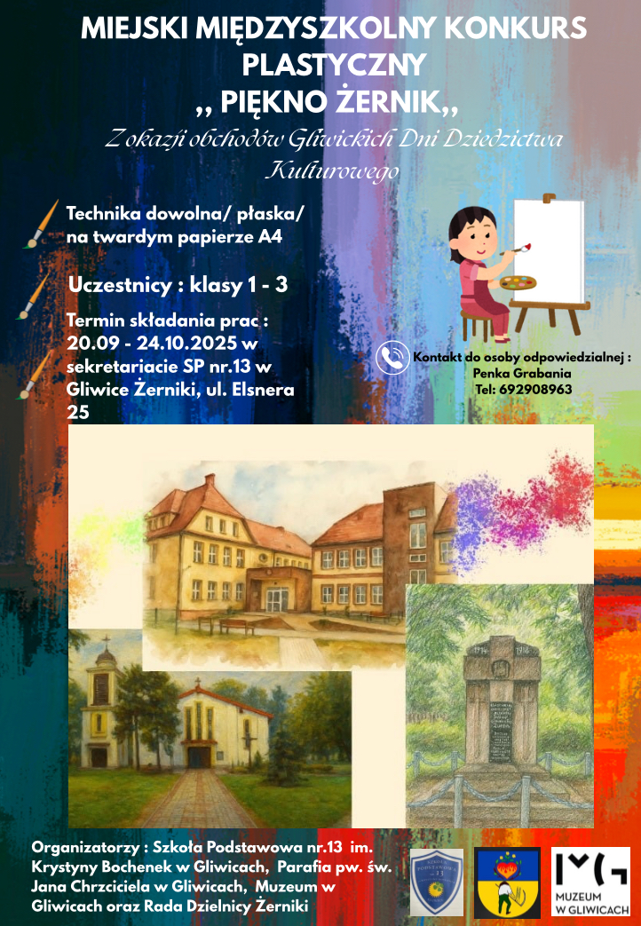 XXIII Gliwickie Dni Dziedzictwa Kulturowego za nami, ale z dzielnicą Żerniki, jeszcze się nie żegnamy! Dzieci i młodzież serdecznie zapraszamy do udziału w konkursie plastycznym i fotograficznym, poświęconym omawianej dzielnicy. Zadaniem uczestników konkursu będzie pokazanie pięknych, ciekawych i unikatowych miejsc w Żernikach. Celem jest popularyzacja miasta Gliwice, jego kultury i piękna w ramach obchodów Gliwickich Dni Dziedzictwa Kulturowego, pokazanie w jakim atrakcyjnym i wyjątkowym mieście mieszkamy oraz zachęcenie młodych mieszkańców Gliwic do poznawania swojego miasta i pogłębiania wiedzy o miejscu, w którym żyją.