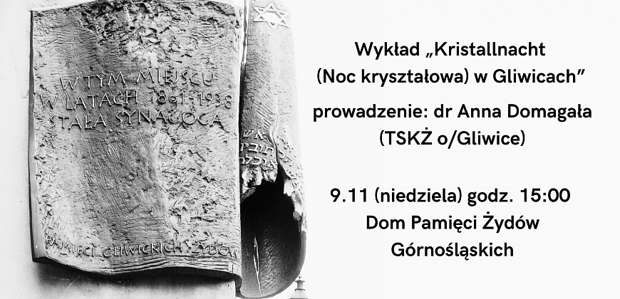 Po wykładzie udamy się pod tablicę upamiętniającą synagogę i wspólnie z członkami i członkiniami gliwickiego oddziału TSKŻ upamiętnimy wydarzenia nocy kryształowej oraz złożymy kwiaty.